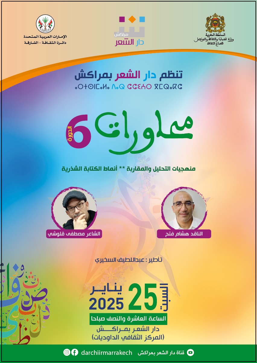 تنظم دار الشعر بمراكش، يوم السبت 25 يناير بمقر الدار (الكائن بالمركز الثقافي الداوديات) على الساعة العاشرة والنصف صباحا، الدورة السادسة من برنامج “محاورات” وخصص موضوعها ل”منهجيات التحليل وأنماط الكتابة الشذرية”، ضمن الصيغة الجديدة التي اقترحتها الدار للموسم الجديد، والخاصة بورشات الكتابة الشعرية للشباب والمهتمين.
