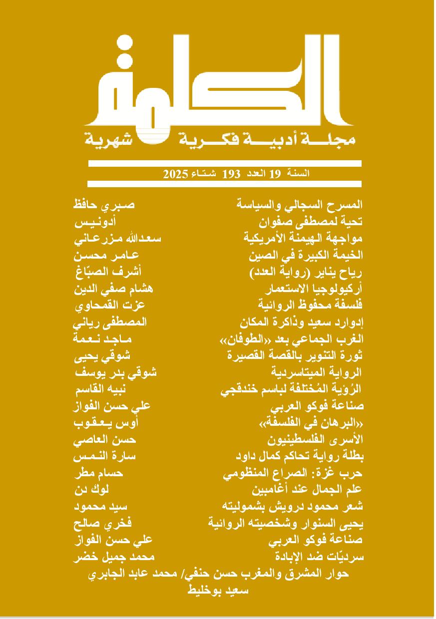 نفتتح العدد الجديد من (الكلمة)، والتي يترأس تحريرها الناقد الدكتور صبري حافظ، العدد 192 لخريف عامها الثامن عشر، بدراسة عن أهم الكتب التي صدرت عن «طوفان الأقصى» تحليلا وتنظيرا، وأخرى لصاحب مقترب النظام العالمي كحركة معرفية تتفاعل فيها المقتربات السياسية والاقتصادية والفكرية. ومع هاتان الدراستان يضم العدد عددا من المقالات والدراسات التي تهتم بالراهن العربي، وبما يحيط بقضيته الأساسية، وهي القضية الفلسطينية التي تستقطب الاهتمام منذ طوفان الأقصى. فهناك مقالة فكرية عن شهيد هذه المعركة الأكبر، وأخرى عن التآلف مع الإبادة، وثالثة عن بهتان الأبالسة الذي يتجلى في الدفاع عن التطبيع مع العدو الصهيوني، وظهيره الأمريكي. وهناك أيضا دراسة عن العنف السياسي عند فالتر بنيامين، وأخرى عن قوات القتل في أكبر سجن على الأرض، وأكثر من دراسة ومقالة عن فلسطين باعتبارها المحور الأساسي للحظة الحضارية الراهنة، مثل البطل في الرواية الفلسطينية، ومراجعات لأكثر من كتاب عن أعمال لكتاب فلسطينيين.
