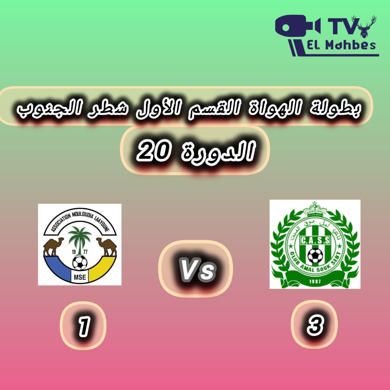 حقق فريق أمل سوق السبت فوزا مستحقا على ضيفه مولودية العيون بثلاثة أهداف مقابل هدف واحد في المباراة التي جمعتهما اليوم السبت 7 مارس 2026 برسم الجولة العشرين من بطولة القسم الأول هواة شطر الجنوب.